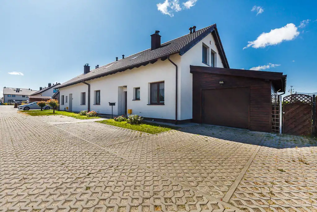 Do domu przynależy 150 m2 zagospodarowanego ogrodu oraz garaż (19 m2) i 4 miejsca postojowe. Budynek jest ogrodzony panelami drewnianymi otulonymi bluszczem.