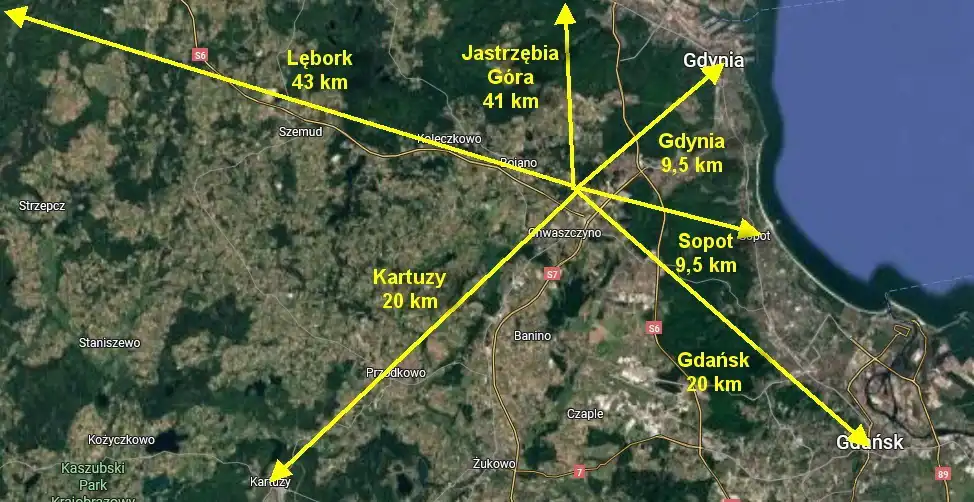 Lokalizacja działki to jeden z jej największych atutów. Chwaszczyno to dynamicznie rozwijająca się miejscowość, oferująca dostęp do pełnej infrastruktury, takiej jak sklepy, szkoły, przedszkola oraz punkty usługowe. W pobliżu znajdują się również tereny zielone, idealne do rekreacji i wypoczynku. Dodatkowo, bliskość Trójmiejskiej Obwodnicy zapewnia szybki i łatwy dojazd do Gdańska, Gdyni i Sopotu, co czyni to miejsce idealnym dla osób pracujących w aglomeracji.