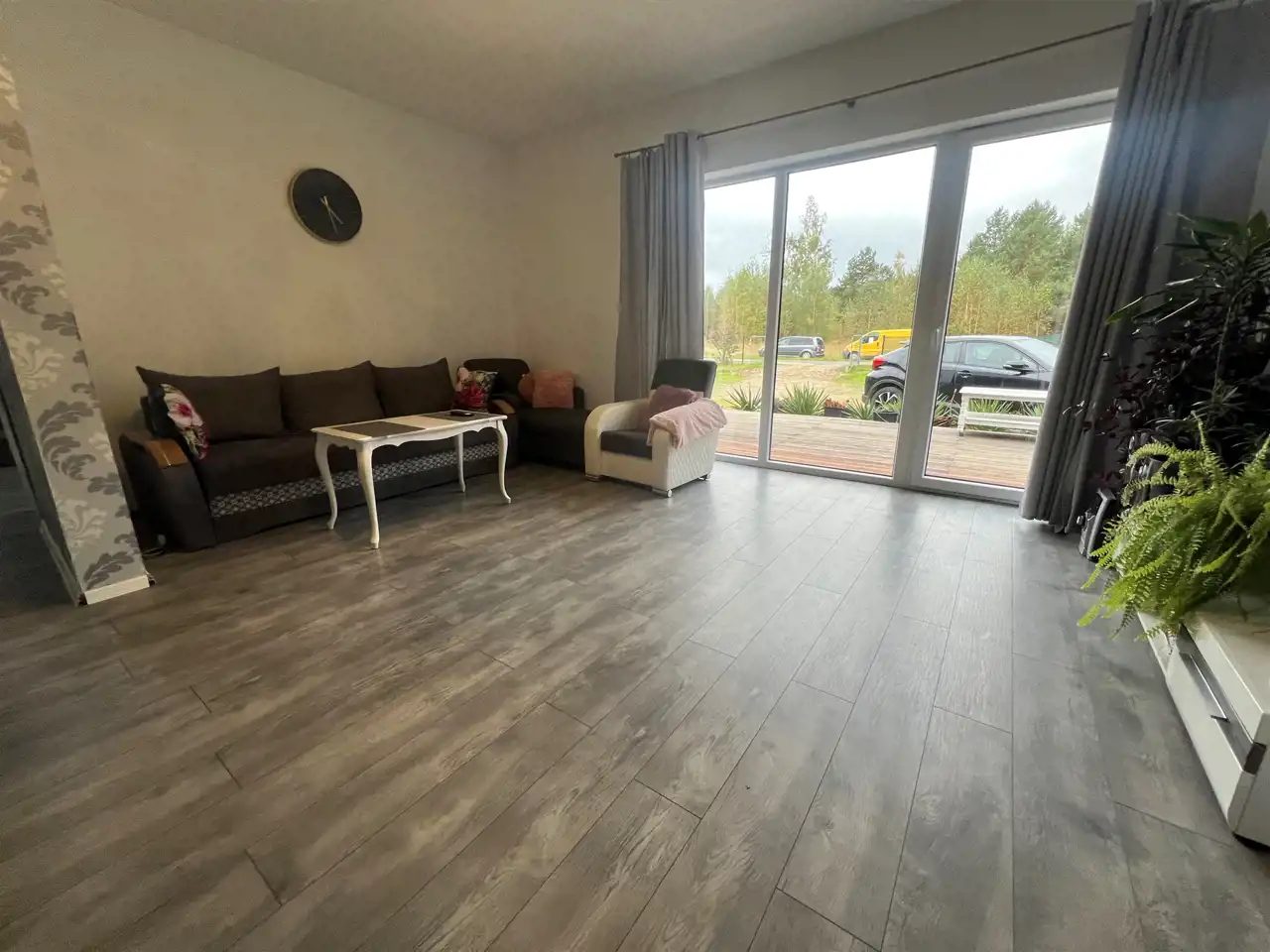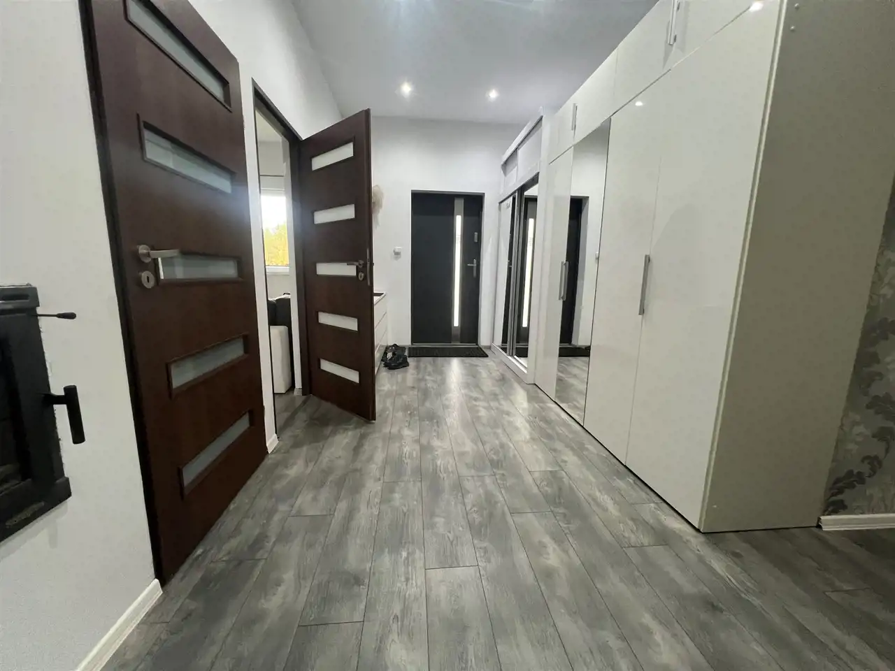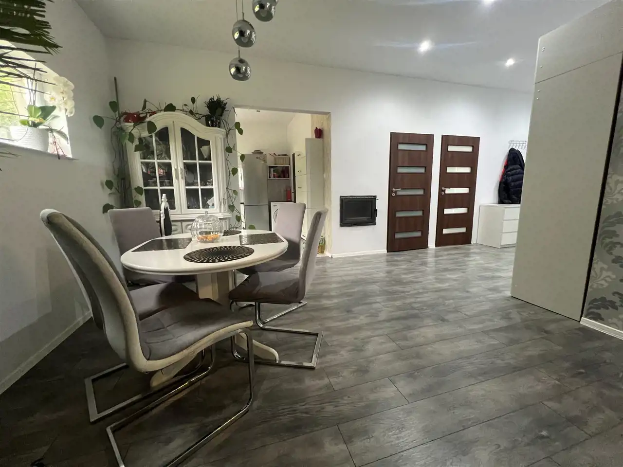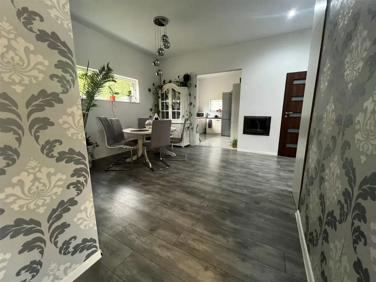 Na ogrodzonej działce znajduje się dom mieszkalny o powierzchni użytkowej 84,54 m2 to przestronny budynek parterowy o klasycznej bryle z wygodnym rozkładem pomieszczeń. Obejmuje strefę dzienną z salonem o powierzchni 24,43 m2 z dużymi oknami tarasowymi i wyjściem na taras, aneksem kuchennym pełniącym funkcję jadalni i odrębną funkcjonalną kuchnią. Strefę wypoczynkową stanowią dwie sypialnie o powierzchni użytkowej 12,19 m2 oraz 9,37 m2. Całość dopełnia łazienka w nowoczesnej glazurze i terakocie, a także przestronny korytarz z szafą w zabudowie do przechowywania odzieży, obuwia i innych przedmiotów. Pomieszczenie gospodarcze o powierzchni 1,58 m2 pełni także funkcję kotłowni dla kominka na paliwo stałe ogrzewającego jedno pomieszczenie oraz stanowi niepowtarzalny klimat dla całego domu.