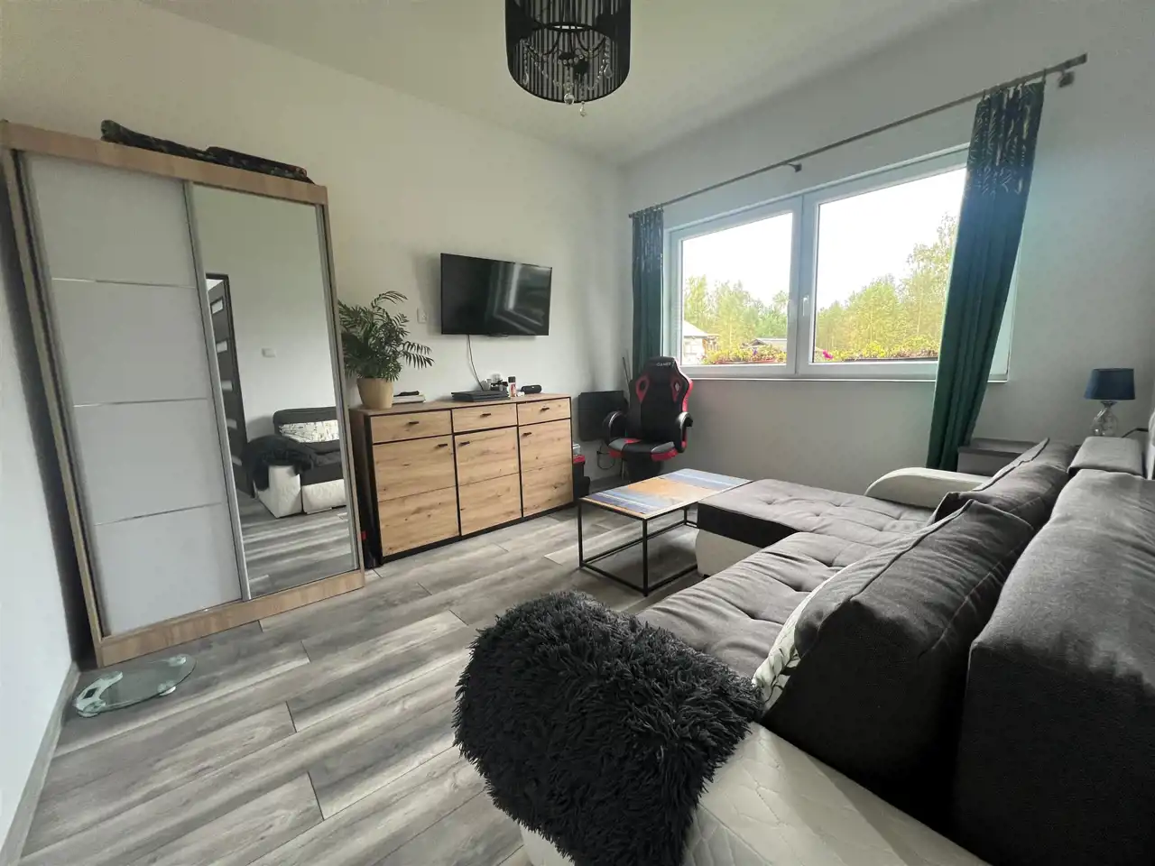 Pozostałe pomieszczenia są ogrzewanie elektrycznie, a w łazience znajduje się ogrzewanie podłogowe. Budynek jest sprzedawany z meblami i sprzętem AGD.