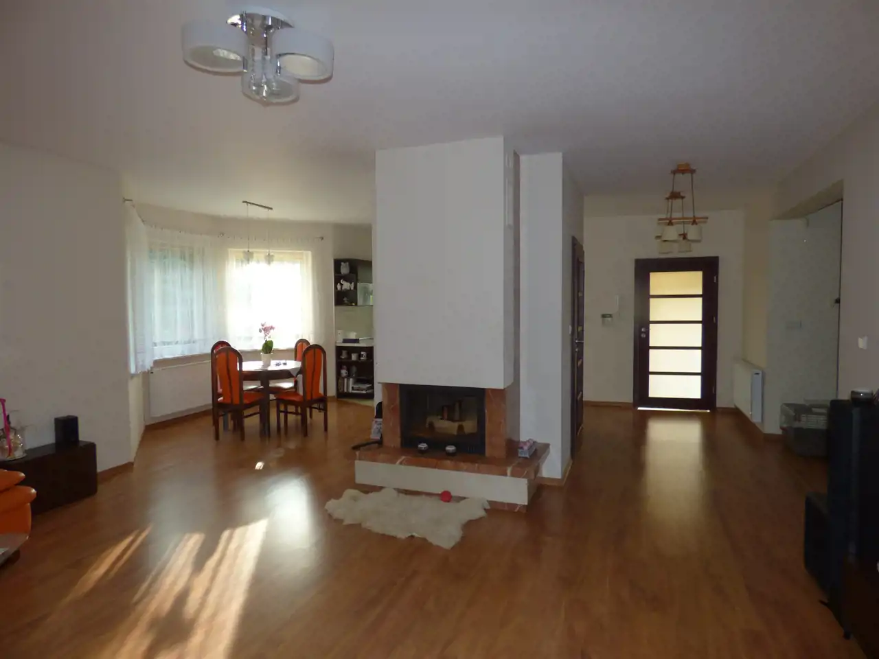 W pokoju dziennym, centralnie umieszczono kominek.