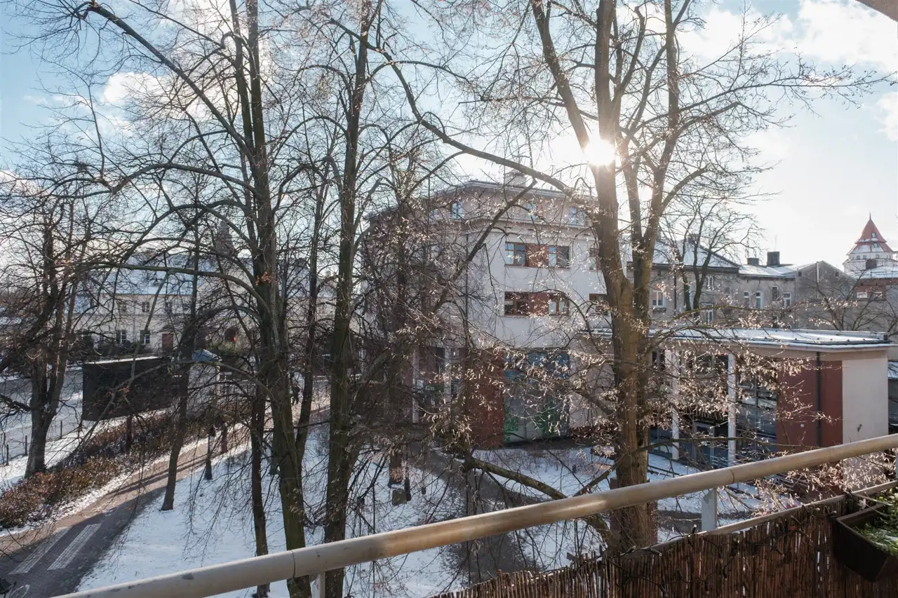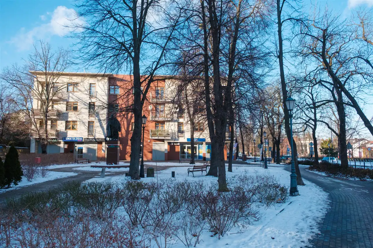 Jednym z głównych atutów lokalu jest lokalizacja. Odległość do dworca PKP w Żyrardowie wynosi około 100 metrów, a dojazd pociągiem do centrum Warszawy zajmuje około 25 minut. Mimo położenia przy ulicy, widok z okien skierowany jest na zieloną, parkową część, co zapewnia poczucie przestrzeni i spokoju. W najbliższym otoczeniu znajdują się sklepy, targowisko oraz pełna infrastruktura miejska. Dostępne jest parkowanie na okolicznych ulicach, a dodatkowo istnieje możliwość wynajmu miejsca postojowego w garażu podziemnym.
