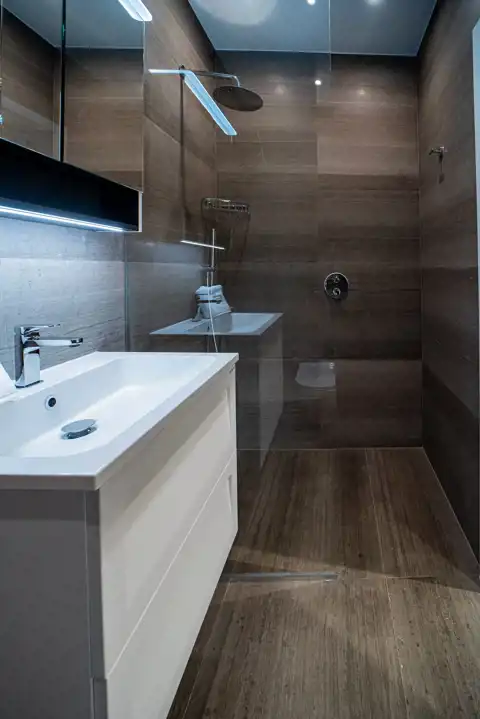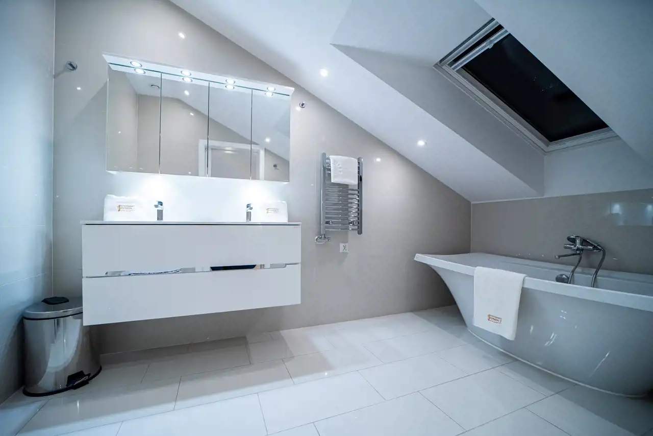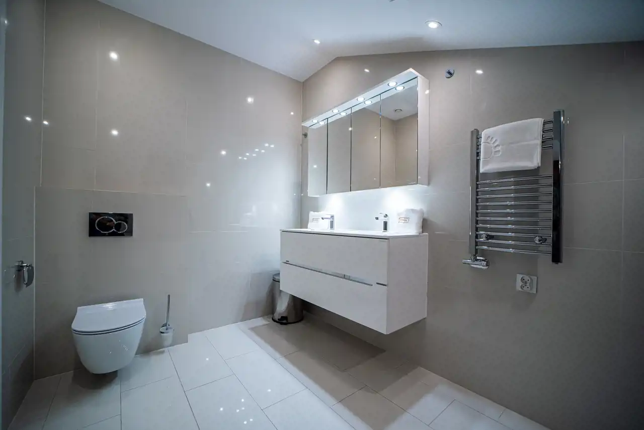 dysponuje własną, luksusową łazienką, wykończoną płytami kamiennymi oraz natryskami oddzielonymi szklanymi