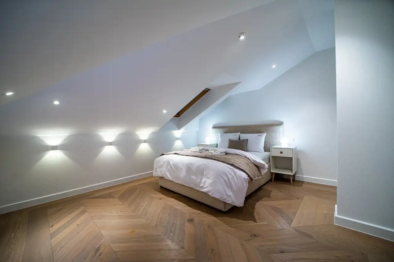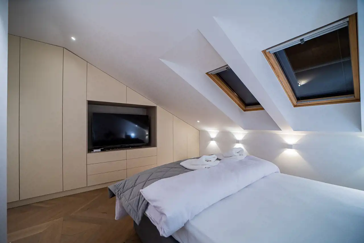 Sypialnie posiadają dedykowaną zabudowę meblową, w tym szafy na wymiar dostosowane do układu ścian oraz