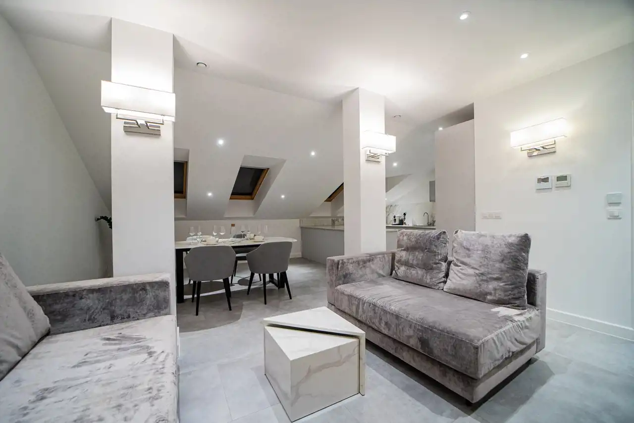 składa się z przestronnego salonu połączonego z nowoczesnym aneksem kuchennym, dwóch niezależnych