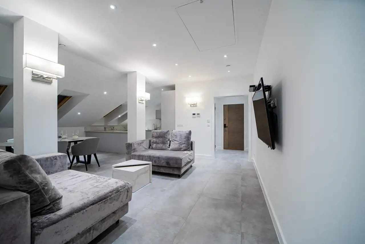sypialni z prywatnymi łazienkami, dodatkowej łazienki oraz korytarza. Mieszkanie jest w pełni wyposażone i