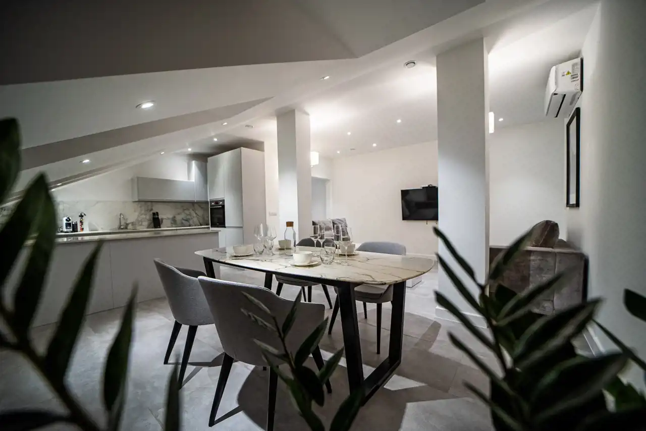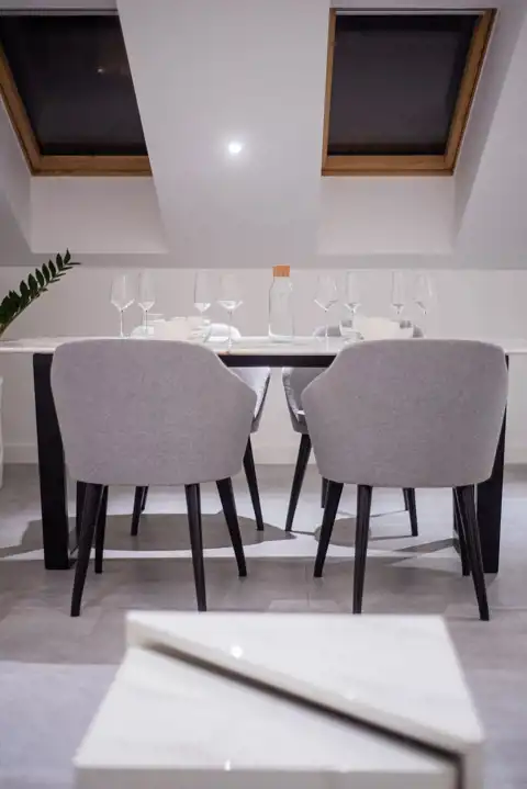 kamiennym blatem, eleganckie krzesła oraz komodę.