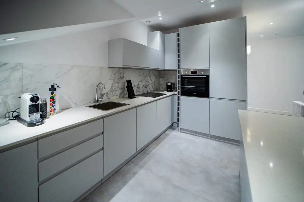 Mieszkanie wyposażono w kompletną, nowoczesną kuchnię z blatami kamiennymi w modnym odcieniu złamanej